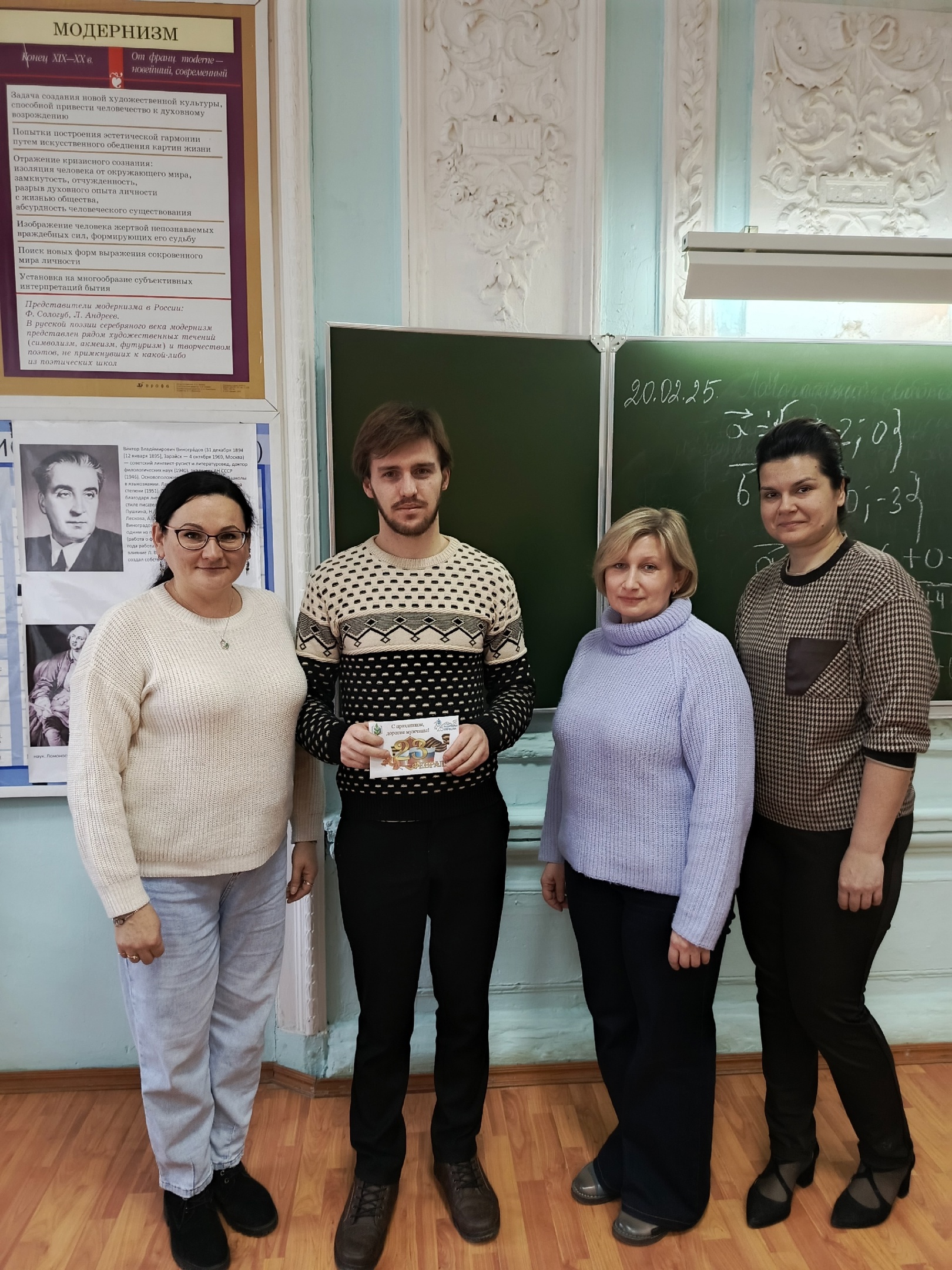 От руководителя образовательного учреждения Ольги Ивановны Анисимовой и председателя профсоюзной организации Ольги Леонидовны Русаковой со сцены прозвучали поздравления для мужской половины коллектива техникума, а так же в адрес всех защитников, для кого понятия долг, отвага, мужество, достоинство и честь являются основополагающими в судьбе.