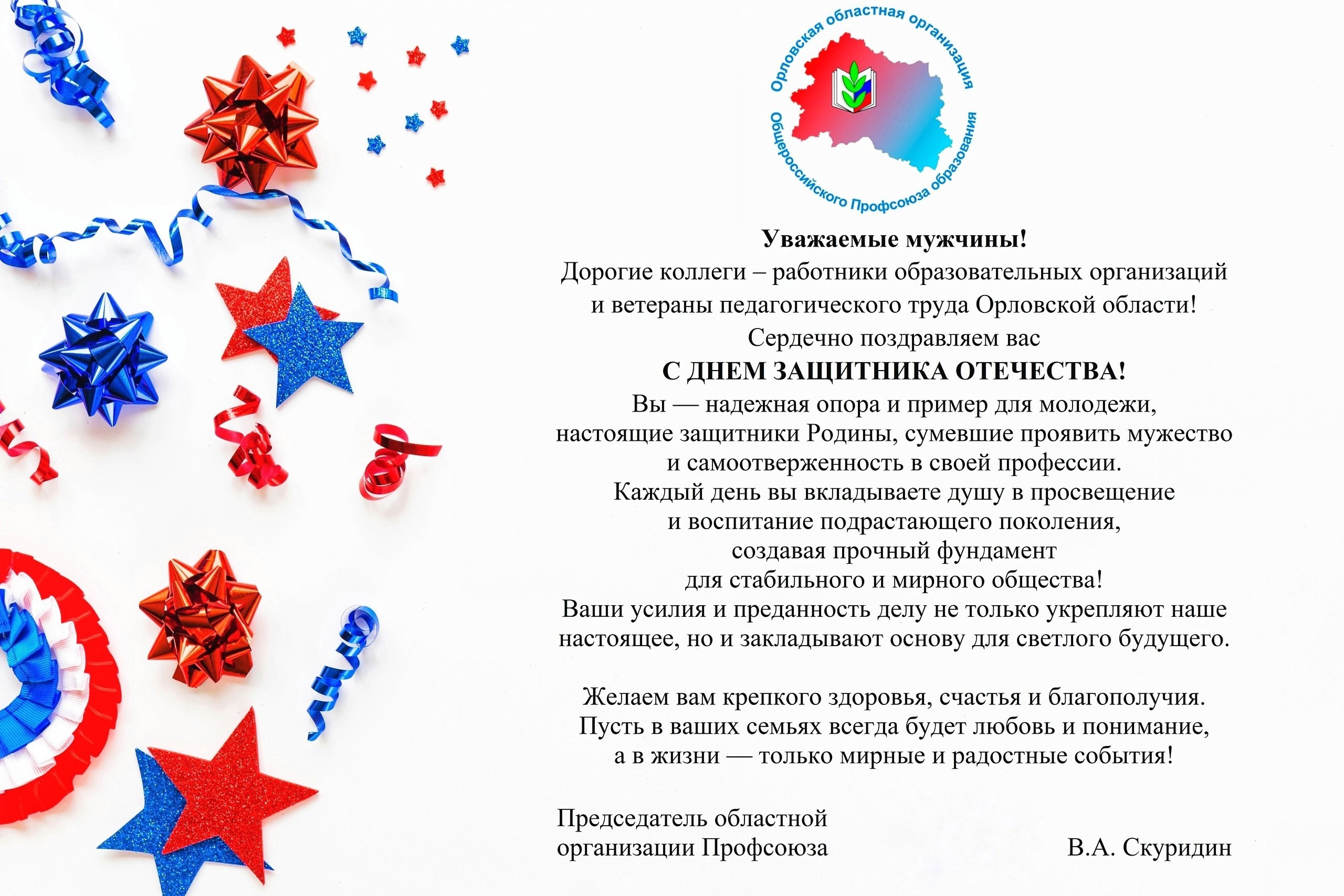 🚩Поздравление С ДНЁМ ЗАЩИТНИКА ОТЕЧЕСТВА от Орловской областной организации Общероссийского Профсоюза образования🚩