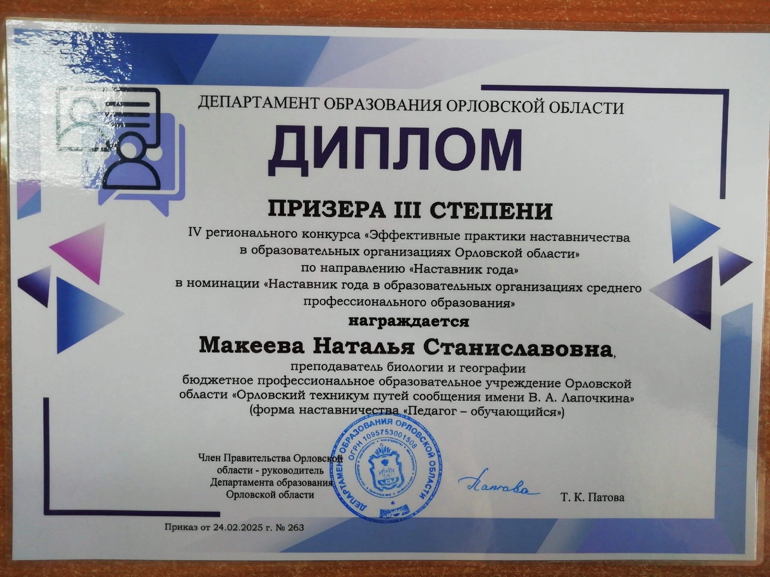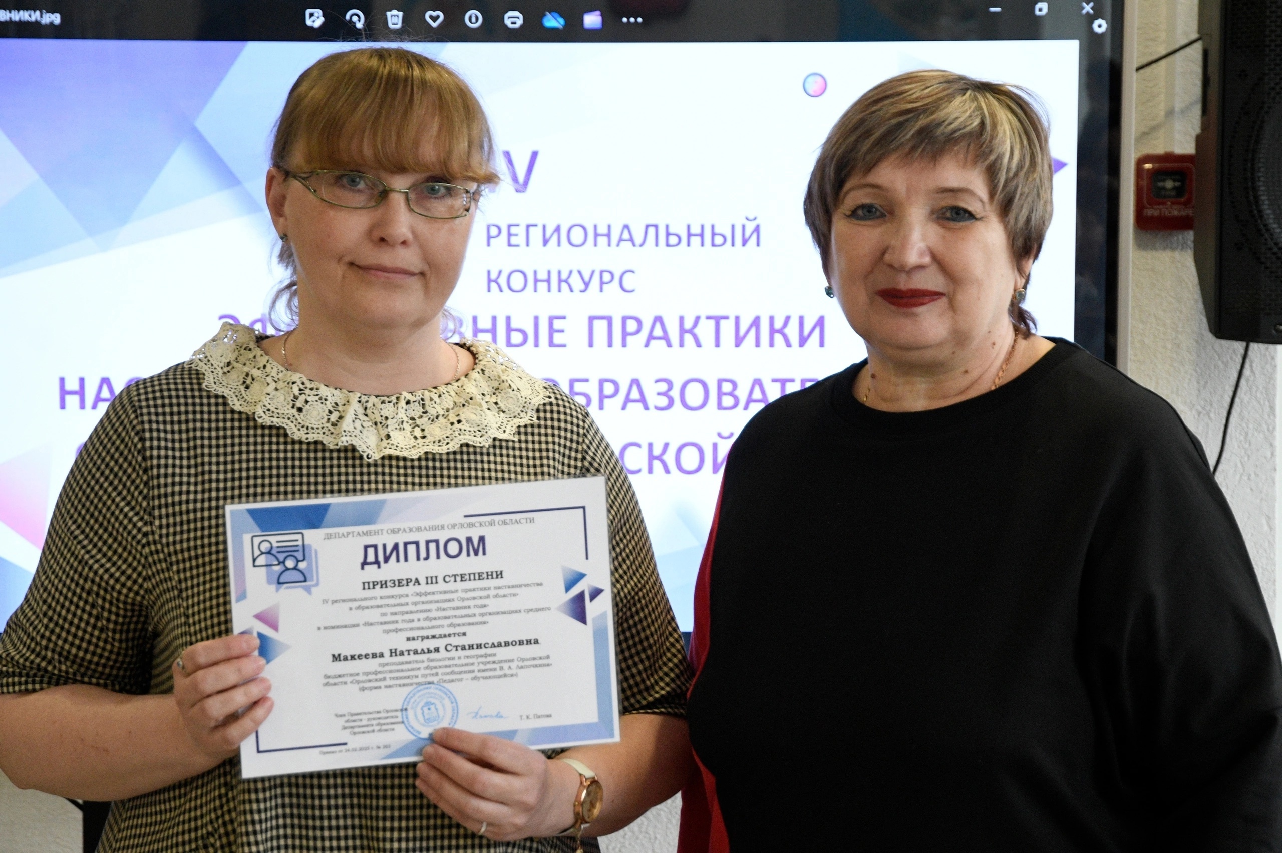 Макееву Наталью Станиславовну с успешным участием в IV региональном конкурсе «Эффективные практики наставничества в образовательных организациях Орловской области».
